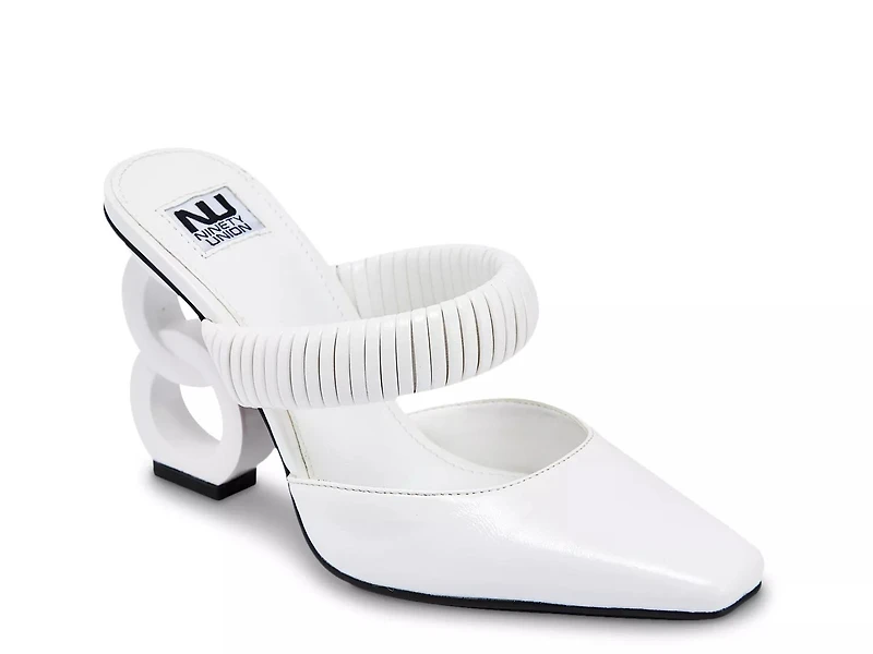 Set your fashion standards above par with the Luna pump from Ninety Union. Square snip toe, wide stretchy padded band on the vamp, and coordinating interlocking chain link heel take the look of this slip-on to new heights.