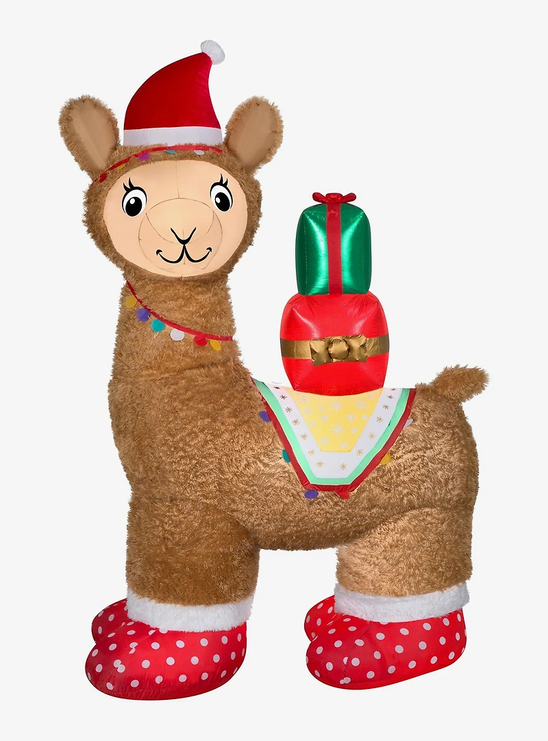 Extravagant and luxurious, our Airblown Inflatable Luxe Alpaca makes an impressive addition to your Christmas decorations. Made with soft plush fabric and metallic accents, our Luxe Alpaca wears a Santa hat, polka dot shoes and carries two stacked gifts. Like all Airblown Inflatables, the Luxe Alpaca is weather-resistant and safe for both indoor and outdoor use. Set up is in a snap for the easiest decorating ever. Just plug it in, stake it down and watch the magic unfold. Includes everything needed for easy outdoor setup. Item cannot be shipped to P.O. Boxes