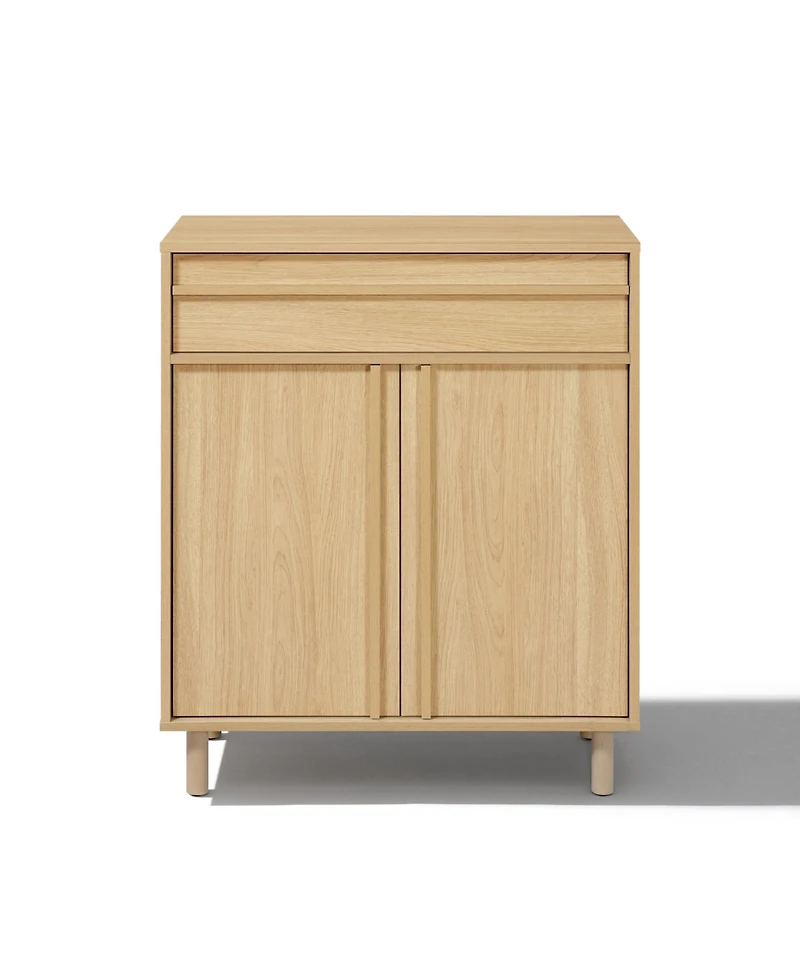 Bring minimalist Japandi charm to your home with this 31.5-inch-wide hazel oak finish storage cabinet. Designed with clean lines, a natural wood texture, and through-handle doors, it embodies a calm, modern aesthetic that suits a variety of interiors. The compact silhouette includes one smooth-gliding drawer for small essentials and a two-door enclosed cabinet with an interior shelf dividing the space horizontally, providing ample storage for dinnerware, games, books, or daily items. Crafted from durable manufactured wood and supported by solid rubberwood legs, it ensures stability and long-term use. The anti-tip hardware included offers added safety, while foot pads prevent floor damage. Perfect for living rooms, dining spaces, home offices, or entryways, this versatile cabinet combines style, practicality, and thoughtful craftsmanship to elevate everyday organization.