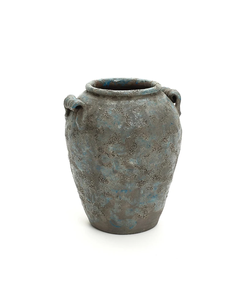 Bring a touch of rustic coastal charm to your home with this antiqued blue and brown terracotta vase. Featuring a hand-applied bubble glaze with a distressed, timeworn finish, this amphora-inspired pottery vase adds vintage character to any setting. Its dual side handles enhance the artisanal look, while the 12" tall profile makes it ideal for displaying flowers, or as a standalone statement piece. Perfect for living rooms, entryways, or farmhouse-style interiors, this decorative vase effortlessly blends rustic elegance and coastal charm.