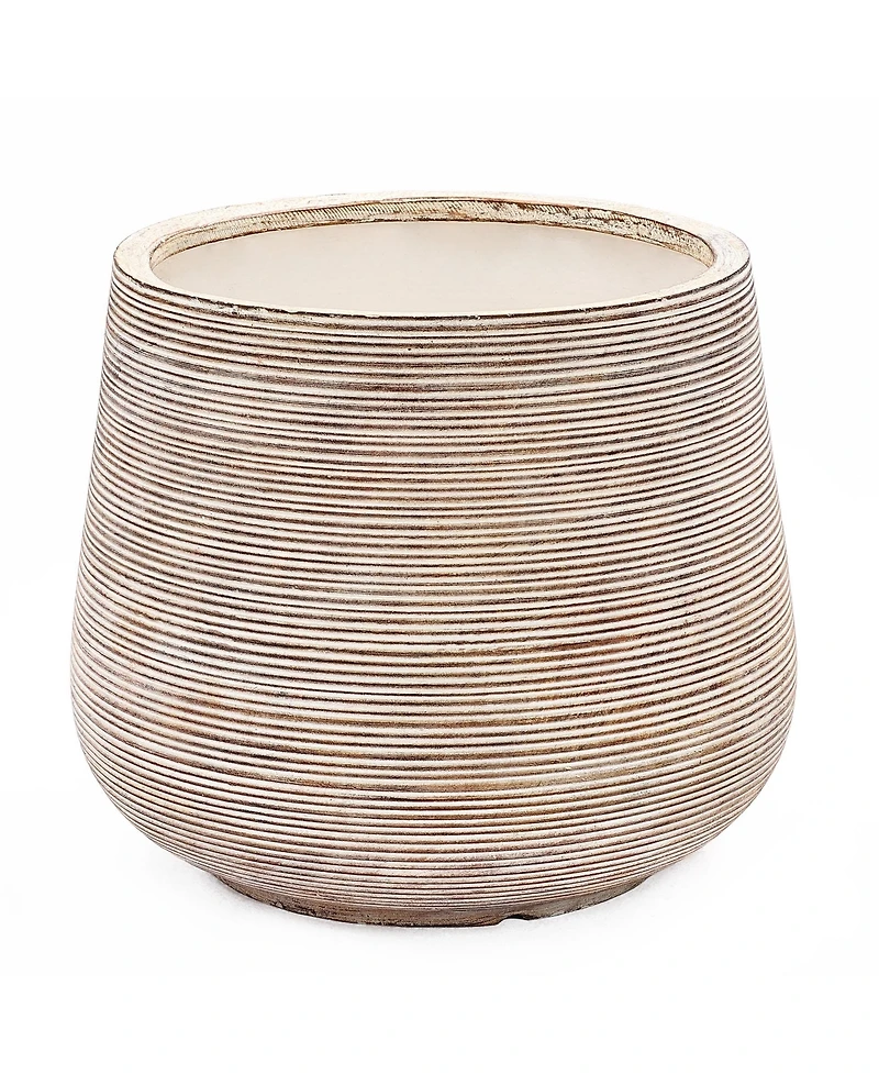 This contemporary-style planter is the ideal setting for showing off your green plants and colorful flowers. Its distressed finish reveals a mixture of tan, white, and gray accents further highlighted by the ribbed design. Whether placed indoors or outdoors, it will complement and enhance the beauty of its surrounding environment. The round planter pot has a drainage hole and plug. The drainage hole helps to prevent over-watering, promotes plant health, and helps plants grow healthily.
