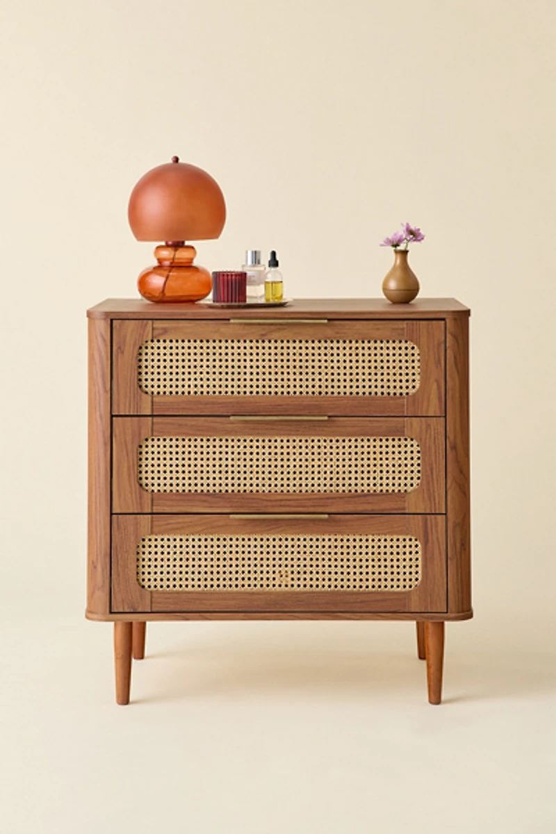 Add chic, boho charm to your bedroom furniture with this low-slung 3-drawer dresser. This chest of drawers feature cane webbing accenting the front of each drawer with gold-finished drawer pulls. Perfect to use in your bedroom or your entryway.