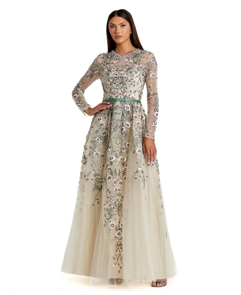 Mac Duggal Women's Long Sleeve Floral Embellished A-Line Gown