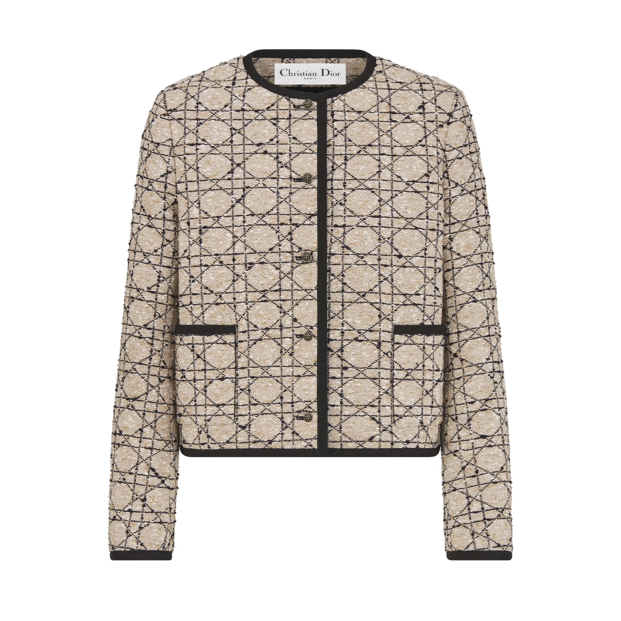 The cropped jacket offers a modern take on Dior's codes of elegance. Crafted in gray cotton-blend tweed embroidered with the Macrocannage motif in silver-tone metallic thread, it features a cropped, regular-fit silhouette adorned with Dior Tribales buttons, showcasing a CD resin pearl inspired by the iconic House earring. Complete with patch pockets and black grosgrain detailing, the jacket can be paired with other Macrocannage creations for a signature look.
