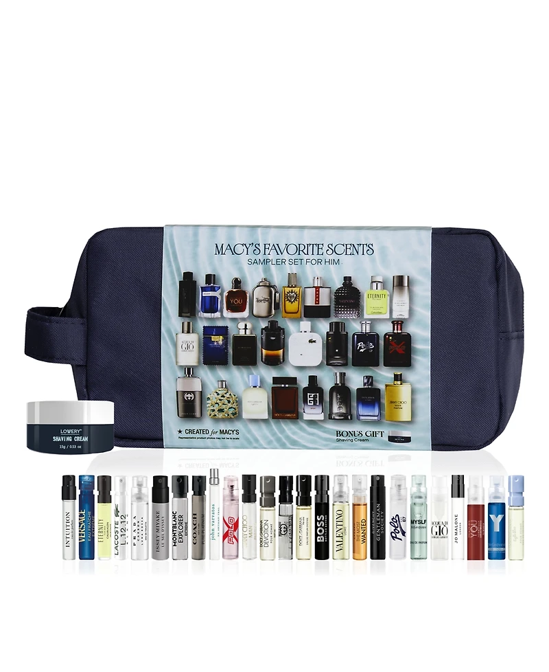 Embark on a curated olfactory journey with this 26-piece sampler set by Macy's, featuring miniature versions of the most coveted men's fragrances, from Gucci Guilty and Calvin Klein Eternity to Montblanc Explorer Extreme and Armani Acqua Di Gio. Packaged in a sleek pouch with a bonus shaving cream, it's the ultimate way to explore, layer, and discover your signature scent, luxury and variety perfectly combined in one collection.