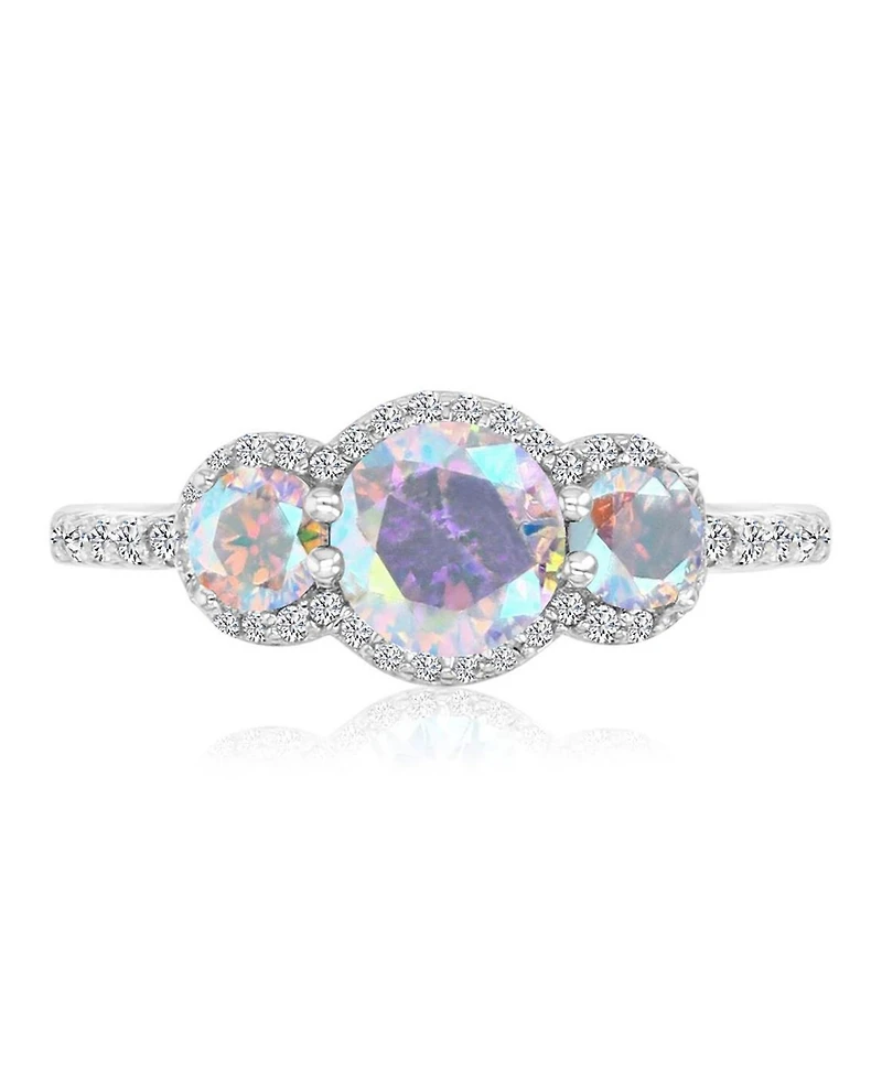 Dazzle in radiant brilliance wearing this Macy's ring showcasing a round pave halo of cubic zirconia surrounding an aurora borealis center stone. Rhodium-plated sterling silver maximizes sparkle and fire for eye-catching impact.