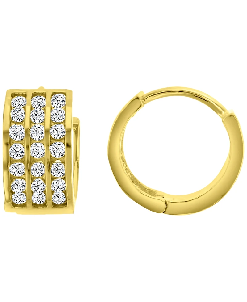 Layered sparkle adds depth to these huggie earrings from Macy's, designed with a three-row micropave channel of cubic zirconia set in 14k yellow gold. A snap-bar closure provides comfortable wear.