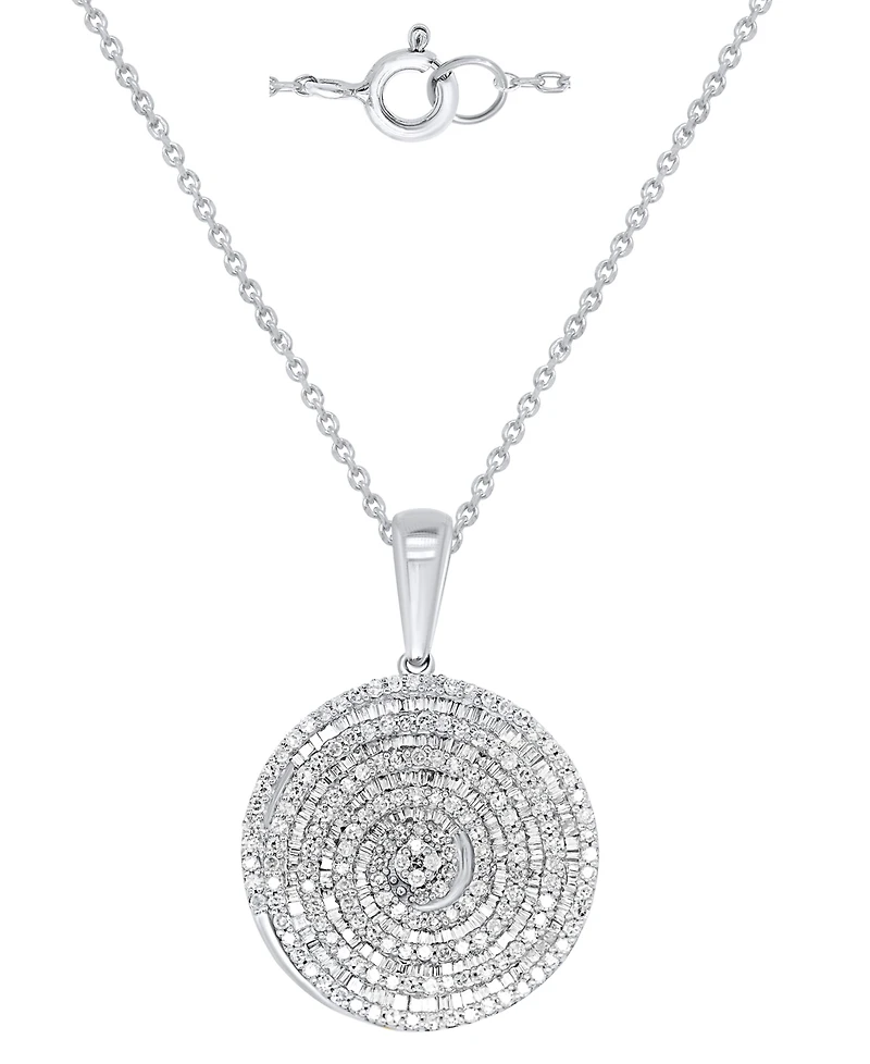 Modern brilliance takes center stage as this pendant necklace from Macy's pairs round and baguette diamonds in sterling silver with white rhodium for layered, dimensional sparkle. A cable link chain with a spring-ring closure frames the design with secure, polished elegance.