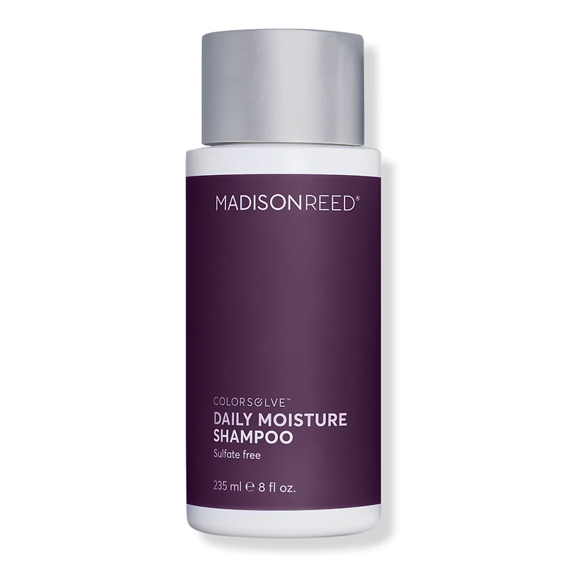 COLORSOLVE DAILY MOISTURE SHAMPOO 8.0OZ. Benefits: Truly customize your hair care with Madison Reed ColorSolve Hair Care System, designed to address the needs of all types + textures of color-treated hair.. Three step system: choose your shampoo + conditioner, add a Color Depositing Shot to your shampoo, shake for 45 seconds before shampooing.. Specifically designed to protect and care for color treated hair.. Contains black spruce extract to protect against the top four elements that cause hair color to fade: sun, water, heat, and harsh detergents.. Sustainable packaging. Made in Italy. Key Ingredients: Black Spruce protects hair against sun, water, heat and harsh detergents. Keratin to strengthen and fortify hair, restore elasticity, and prevent breakage. Argan Oil restores shine and nourishes hair from root to tip. Ginseng Root Extract softens hair and alleviates split ends. Formulated Without: Ammonia. Parabens. Resorcinol. PPD. Phthalates. Gluten. SLS. Titanium Dioxide.