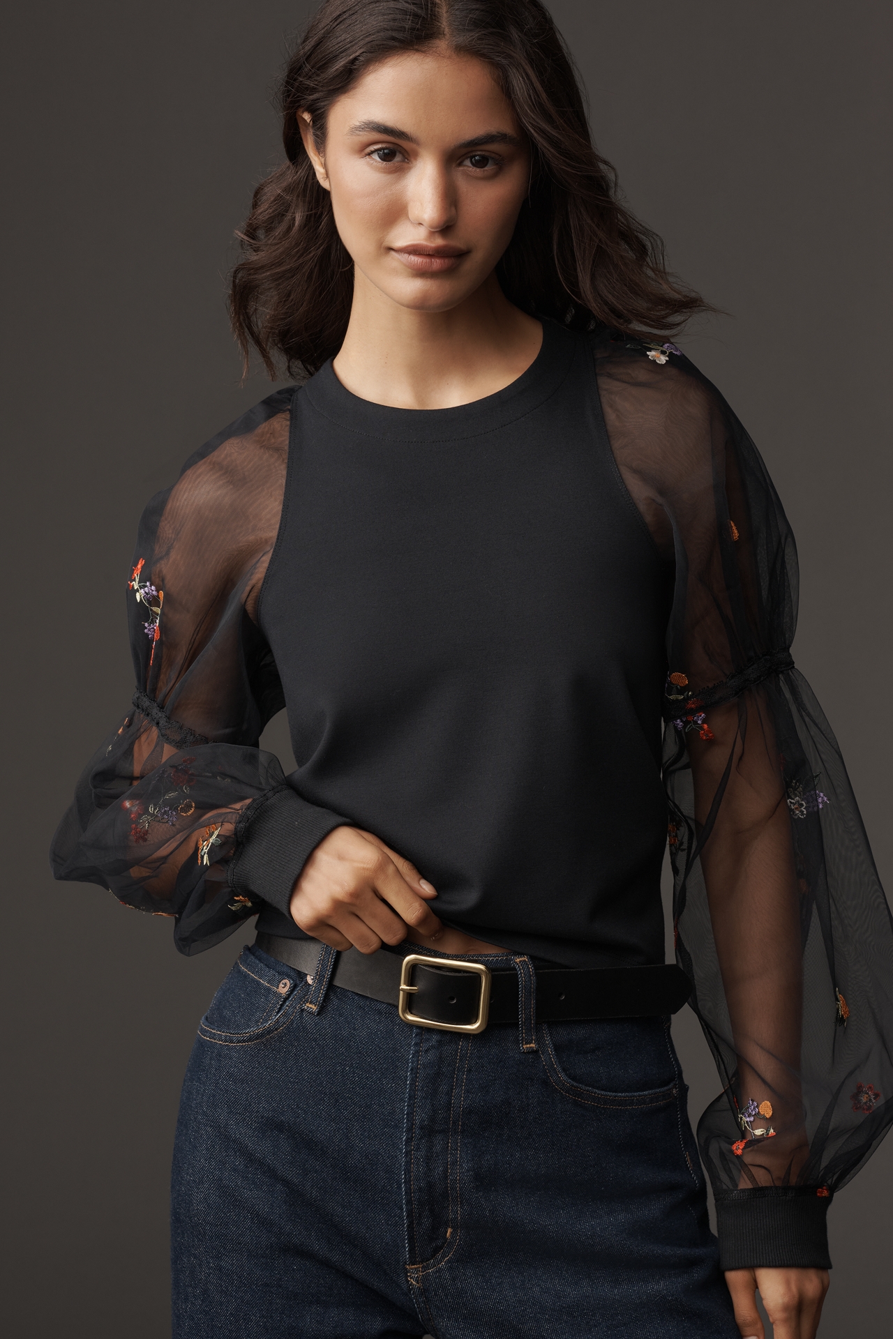 Maeve Embroidered Sheer-Sleeve Pullover