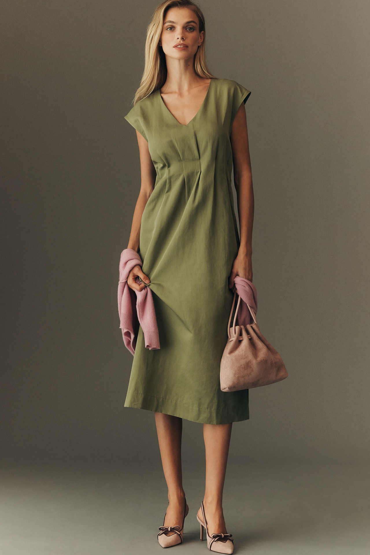 Maeve Linen Blend Short-Sleeve Waisted Midi Dress