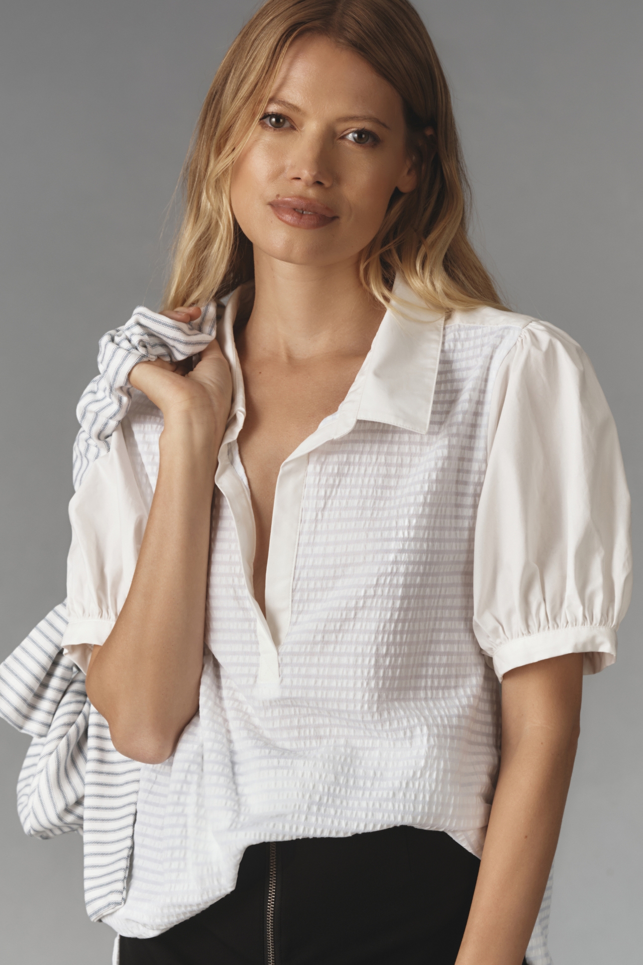 Maeve Woven & Knit Ruched-Sleeve Twofer Top