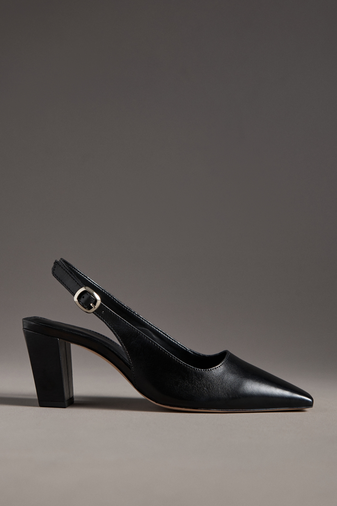 Made from smooth leather, these slingbacks feature a snip toe, buckle slingback strap, and a slanted block heel.