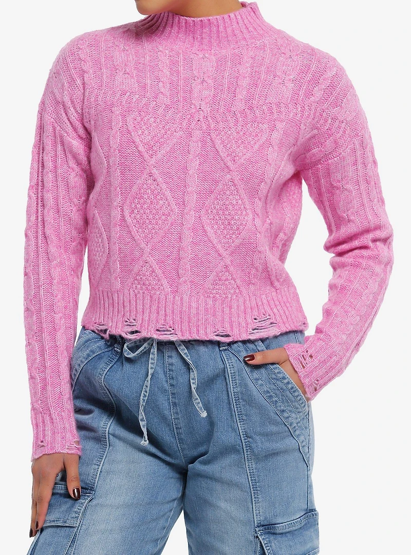 Keep it cute and cozy with this cropped knit sweater! This comfy cable knit sweater comes in a rich marled magenta, with distressed detailing throughout and a mock turtleneck.