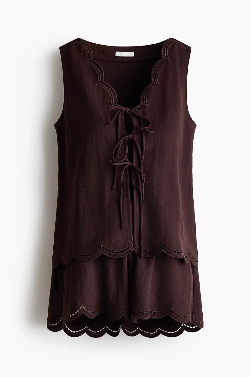 Set in woven fabric with a top and shorts, both with eyelet embroidery and scalloped trim. Sleeveless top with a low-cut V-neck, open front with three sets of narrow ties, and darts at back. Shorts with small ruffle trim and covered elastic at waistband.