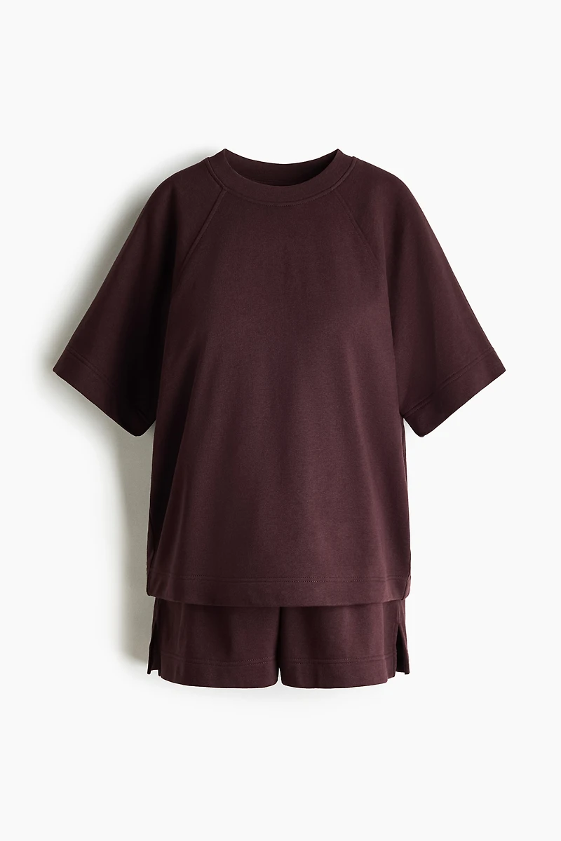 Set in lightweight fabric with a T-shirt sweatshirt and sweatshorts. T-shirt with a crew neck, raglan sleeves, and straight-cut hem with a slit at sides. Shorts with a low waist, drawstring and smocked elastic at waistband, discreet side pockets, and a small slit at hems. For wear during and after pregnancy.