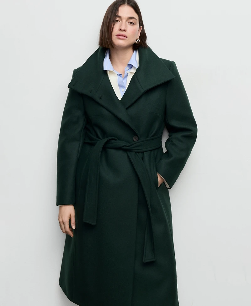 Clean lines ground the Manteco Wool Coat with Belt from Mango. Made from Italian Manteco wool-blend fabric, this long wool coat features straight design, funnel neck, long sleeves, belt loops, nightgown-style belt, front button closure, and inner lining.