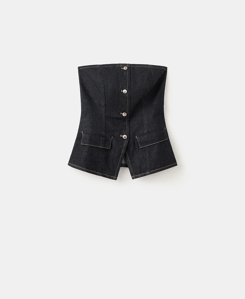 Elevate denim styling with Strapless Denim Top from Mango. Made from denim-style cotton fabric, the top features tailored cut, strapless neckline, sleeveless shape, two side flap pockets, and front button closure. With a history spanning four decades, Mango is one of Europe's leading fashion brands. From Barcelona, on the banks of the Mediterranean, they delight the world with their fashion proposal and lifestyle. Mango's creative team works every day to translate fashion trends into their own language, which they deliver to customers in a personalized way while paying attention to detail.