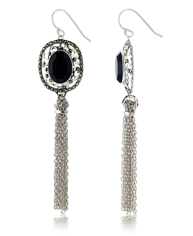 Marcasitre Faceted Onyx Tassel Wire Earrings in Sterling Silver