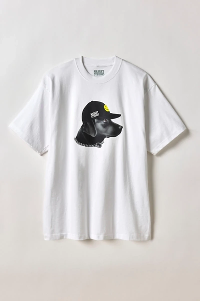 Graphic tee from Market Studios with a streetwear edge. Classic cotton jersey t-shirt cut in a slightly boxy fit. Short sleeve tee with a ribbed crew neck.