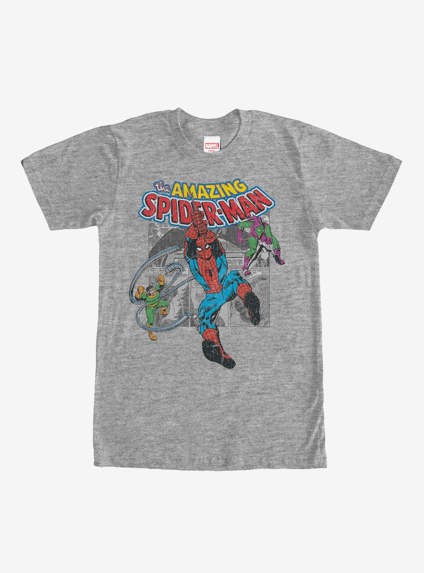 Peter Parker better watch out because his two greatest foes are working together to defeat him on the Marvel Amazing Spider-Man Battles Evil Heather Gray T-Shirt! A distressed print features the webbed-hero swinging to safety and escaping the clutches of both Dr. Octopus and Green Goblin on this gray Marvel shirt. 60% Cotton, 40% Polyester.