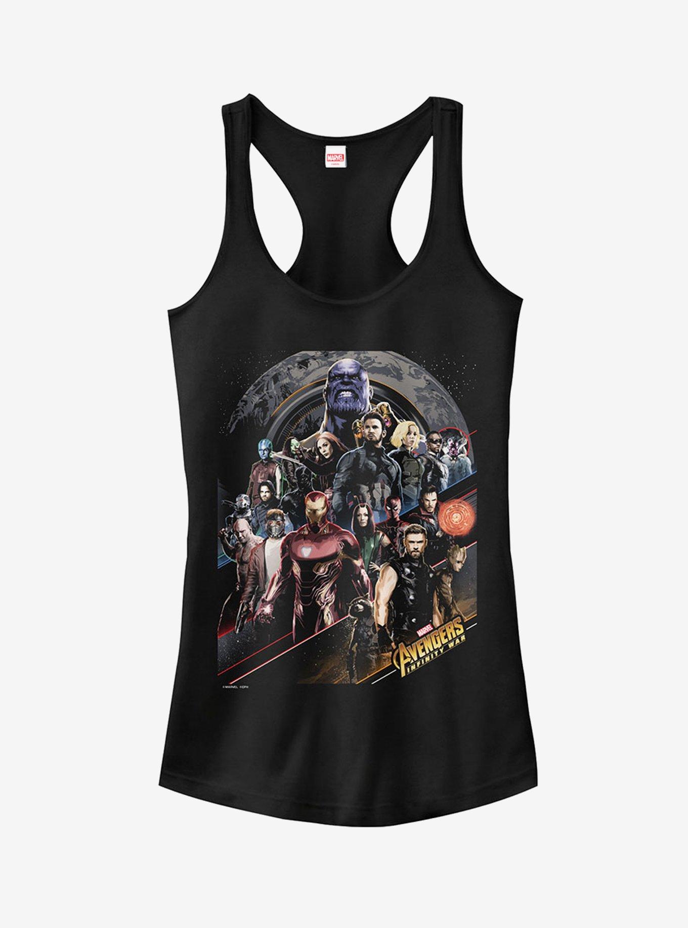 The Avengers need to work together to defeat the power of Thanos and the Marvel Avengers: Infinity War Character Scene Juniors' Racerback Tank Top. All of your favorite characters Captain America, Thor, Black Widow and more are portrayed with the Guardians of the Galaxy in a cool print across the front of this fitted Thanos tank top.