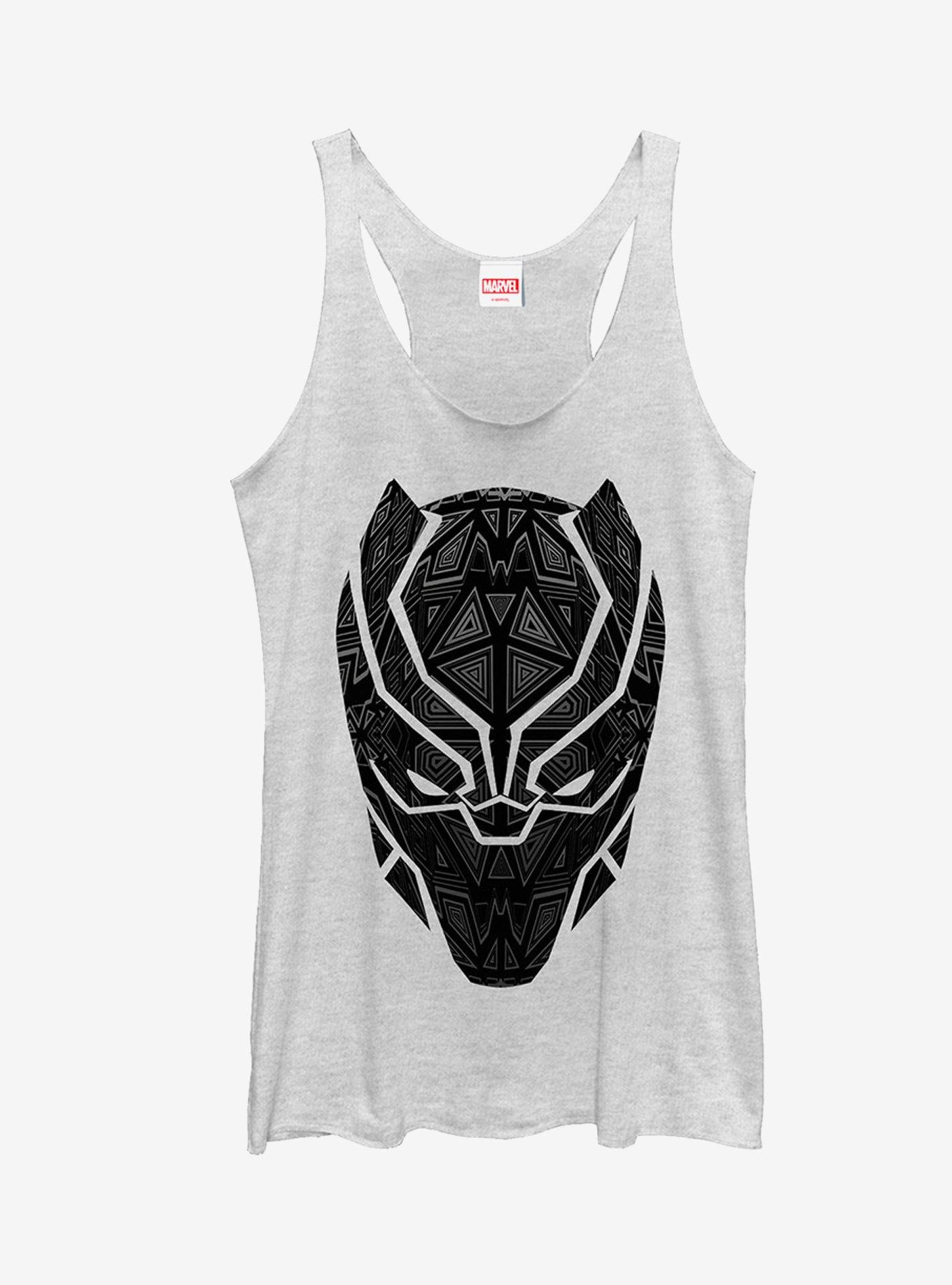 Black Panther has returned home to rule Wakanda and show off the awesome Marvel Black Panther Ornate Mask Women's Racerback Tank Top! This cool classic Black Panther tank shows off an ornate Black Panther mask down the front. Designed with raw-edge hems.