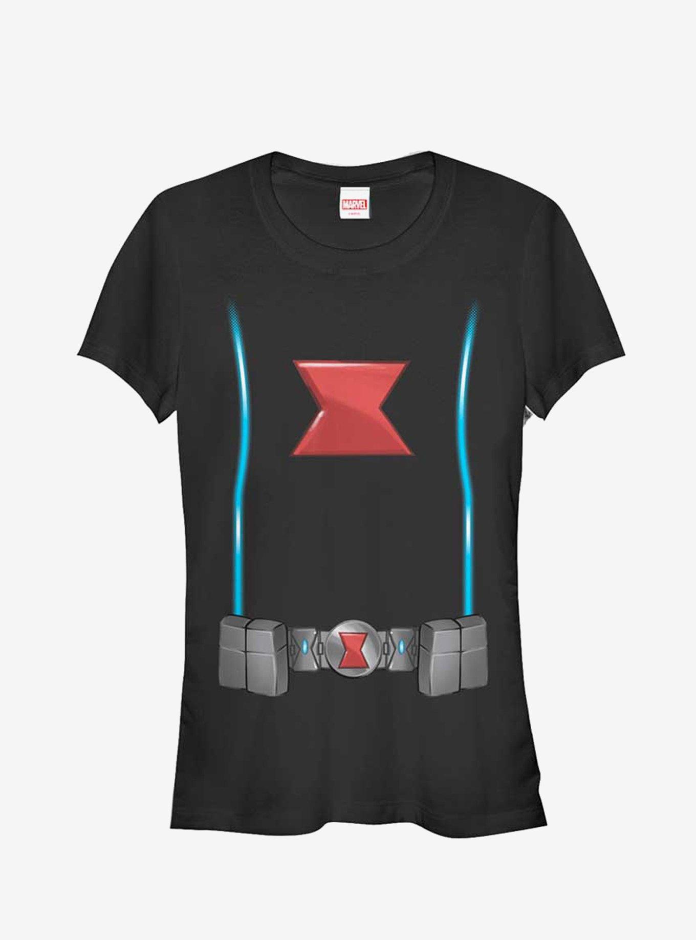 If you're Black Widow's biggest fan then you can show it with the Marvel Black Widow Costume Black T-Shirt. This fitted fun Black Widow shirt is styled like Black Widow's famous costume, complete with the red hourglass and belt. 100% Cotton. Runs small, size up.