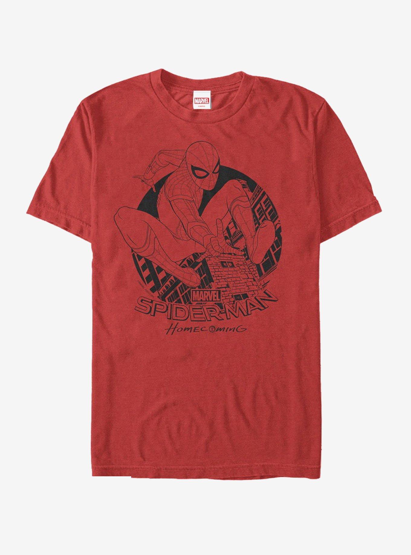 You've got your ticket for the Homecoming dance so now all you need is to dress up in the Marvel Spider-Man Homecoming Protector Red T-Shirt! A classic black print of Spider-Man flying over the NYC skyline is encircled by the Spider-Man Homecoming logo on this cool red Spidey shirt. 100% Cotton.
