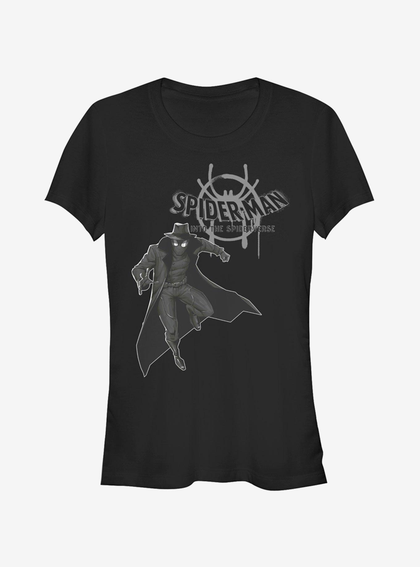 What's black and white and mysterious all over? This guy. Celebrate your love for Spider-Man Noir with this fitted black tee.