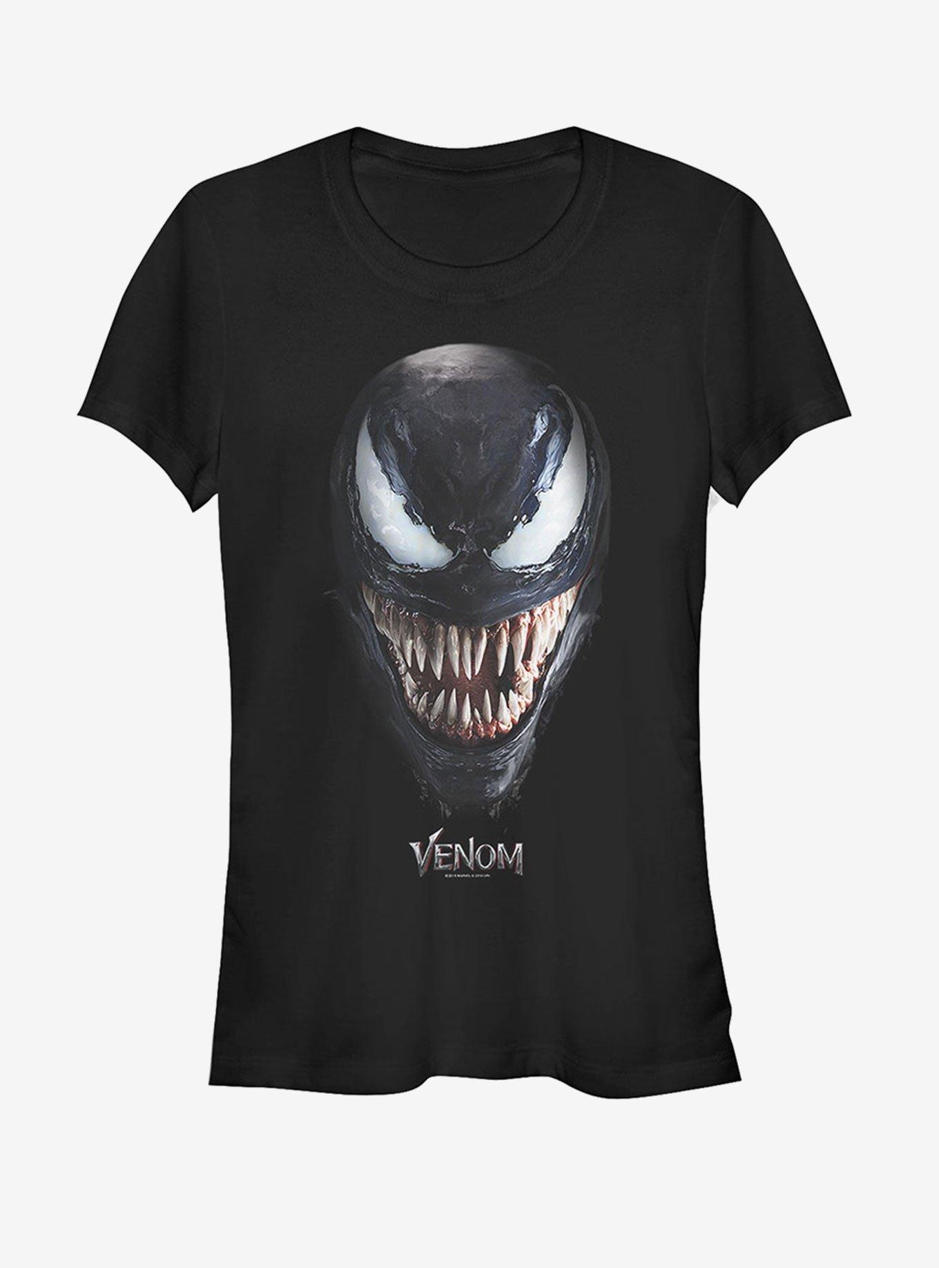 Eddie Brock thinks he has a parasite...only it's the most terrifying parasite he's ever seen! Check out the alien symbiote smiling pretty on this epic Marvel Venom Film All Smiles Girls T-Shirt. Venom is portrayed with its sharp teeth exposed on this awesome Venom shirt in celebration of the newest Marvel film.