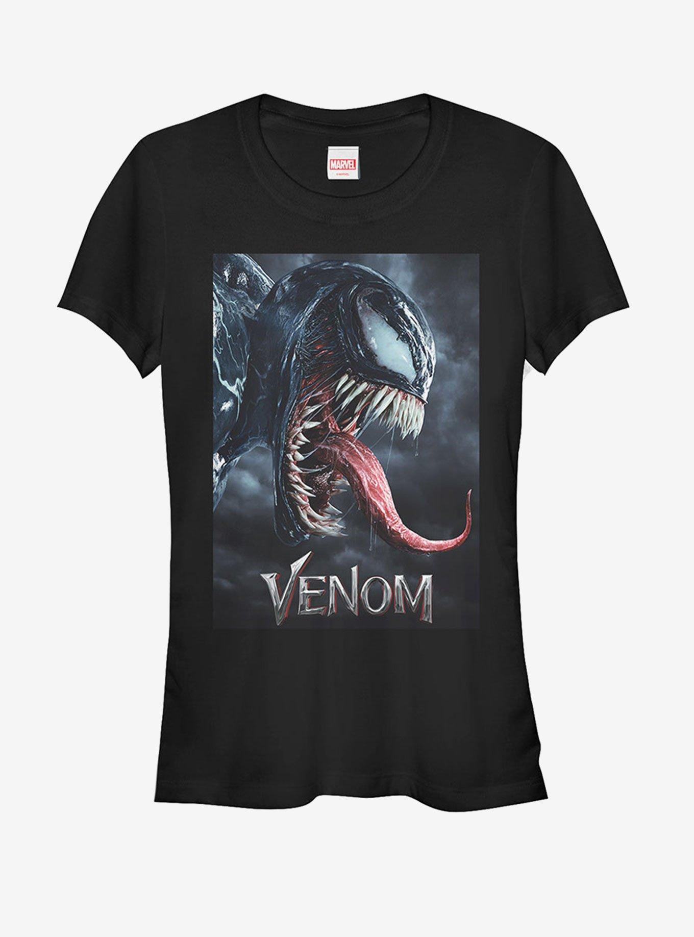 So many snacks, so little time! There's always time for the Marvel Venom Film Tongue Portrait Girls T-Shirt though! Venom can't wait to eat some arms and legs on this creepy Girls tee that shows off the alien symbiote with his tongue out. Runs small, size up.