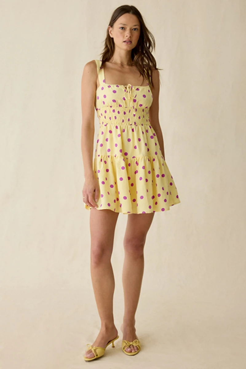 Whimsical yellow & purple polka dotted Maude Club mini dress in a fit-and-flare silhouette. Short polka dot dress designed in a breezy, linen-blend featuring a square neckline, tank straps, tie-front bow & keyhole detail and a stretchy, smocked waistline for an easy fit. Finished with a full, twirl-worthy tiered skirt!