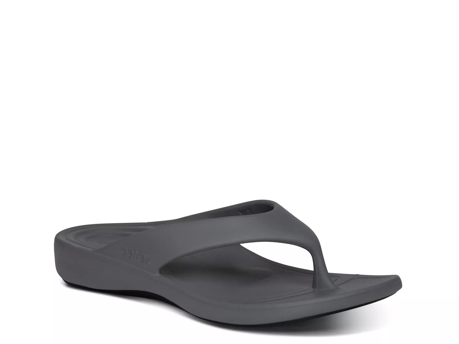 Stroll across the streets or beach in comfort wearing the Aetrex Maui flip flop that's perfectly crafted from UltraSky injected EVA to lend super-soft cushioning, shock absorption and long-lasting usage. This slip-on has EVA & rubber sole that adds to the flexibility and the minimalist yet stylish design makes a bold statement on or off the beach.