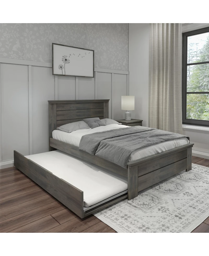 Bring the fun of the farm in with the Modern Farmhouse Full Bed with Panel Headboard and Trundle from Max and Lily. With a fabulous barnwood finish and enhanced safety, this bed offers the perfect combination of fun and functional that kids and parents love. Added panel headboard creates a stylish look. Coordinating twin trundle bed makes sleepovers simple. The durable, low-voc finish makes this bed a safe choice for any kids room. Sleep and storytimes feel secure thanks to a 400 lb resting weight capacity for each sleeping surface. Solid New Zealand pine wood construction, solid plywood slats and metal support bar provide strong, durable support. Works with standard full-size mattresses and does not require box springs or bunkie boards. Super safe design meets or exceeds Federal safety standards for kids furniture. Ships in two boxes with instructions and hardware included. 2+ adults make assembly quick and easy.