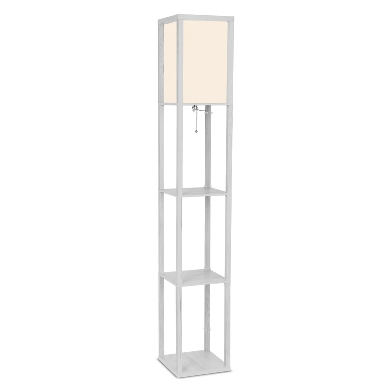 Brightech Maxwell Shelf Floor Lamp: Tall, free-standing lamp with a translucent off-white shade and a frame in four colors. Offers diffused light and three display shelves, ideal for modern minimalist decor. Includes Brightech LightPro Led Bulb (9.5W, 800 Lumens, 3000K). Smart home compatible (Alexa, Siri) via a smart plug (sold separately). Easy 30-minute assembly. Recommended for hard floors or delicate rugs (includes protective foam pads). Backed by a 3-year warranty. Provides shelf space and a cozy ambient glow for your living room, bedroom, or office