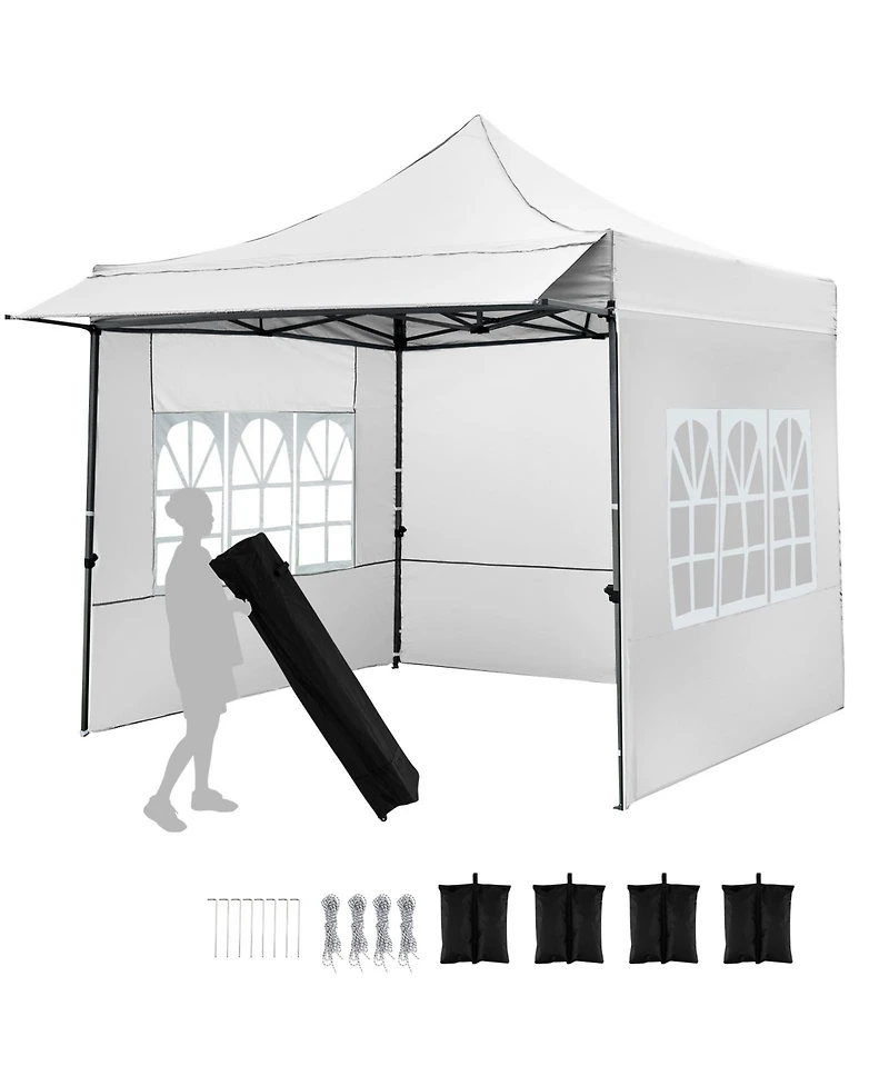 Enjoy flexible shade and a brighter shelter with this 10' x 10' pop-up canopy tent featuring three removable sidewalls and a rear clear window panel. The 420D Oxford canopy helps block Uv rays and resists light rain for dependable outdoor comfort. A strong metal frame with reinforced truss plates, plus base plates, sandbags, wind ropes and stakes, helps keep the canopy secure in breezy conditions. Quick tool-free setup folds down into a rolling carry bag for easy transport and storage. Includes four height settings and increased headroom for events like weddings, beach days and backyard BBQs.