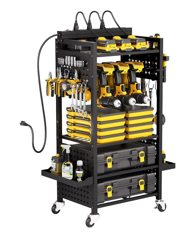 Tackle clutter and power your projects with this 5-tier Tool Organizer Cart with built-in charging station. Designed for garages, workshops, and Diy spaces, it features 4 mesh shelves, a dedicated drill holder, side hooks, and trays to keep all your tools visible and within reach. The adjustable middle shelf fits larger toolboxes, while the integrated 8-outlet power strip (15A, 125V, max 1875W) with 6.6 ft cord lets you charge and run multiple tools at once. Heavy-duty steel construction supports up to 150 lbs, and the rust-resistant, powder-coated finish stands up to tough environments. Four 360° swivel casters, including two with brakes, make it easy to roll your tool rack wherever you need it and lock it securely in place. With pegboard panels for extra hanging storage and simple assembly with all tools included, this rolling storage cart is a reliable work companion and a perfect gift for Diy enthusiasts.