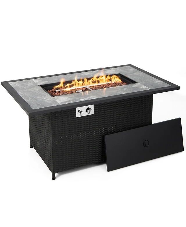 52'' Propane Fire Pit Table Marble Tabletop Rattan Wicker w/ Rain Cover Lava Rock
