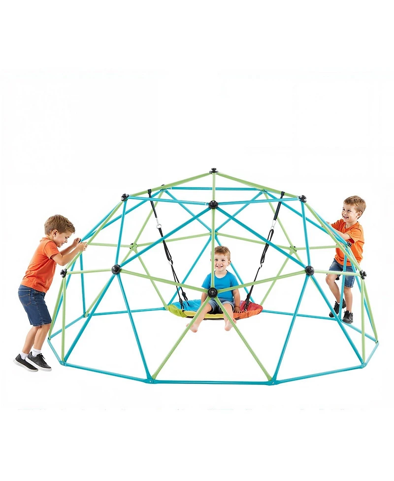 Turn your backyard into an adventure playground with this 10FT Geometric Dome Climber with Saucer Swing, designed for boys and girls ages 3–10. Built from thickened steel tubes in a stable triangular structure, it stays sturdy and wobble-free as kids climb, swing, and explore. The colorful zinc coating resists rust and corrosion for long-lasting outdoor fun, while non-slip grips and smooth, burr-free tubes help protect little hands. Astm and Cpc certifications give parents extra peace of mind. With a 1000 lbs max load, it comfortably supports 4–5 children at once, encouraging active play, strength building, and social interaction. Included gloves, wrenches, and detailed instructions make assembly fast and straightforward on any flat surface.