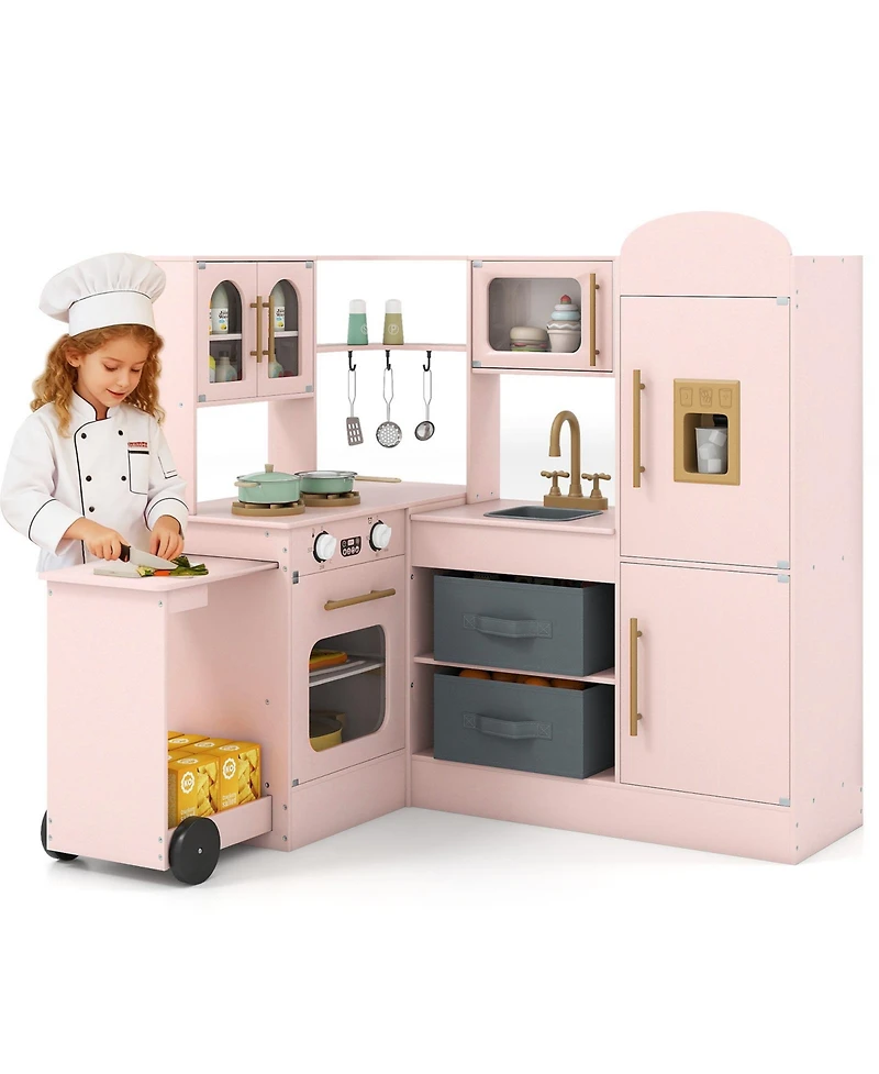 Create a realistic cooking corner for kids ages 3+ with this space-smart wooden play kitchen. The stoves light up and play fun sounds, and the click-turn knobs make pretend cooking feel real. A corner layout saves space, while the retractable rolling countertop lets kids adjust their workspace easily. Built-in storage-2-door cabinet, open shelf, hanging hooks, and fabric bins-keeps accessories organized and teaches tidy habits. Includes microwave, sink, oven, fridge, and freezer to support cooperative play, sharing, and creativity. Astm and Cpsia compliant for added peace of mind.