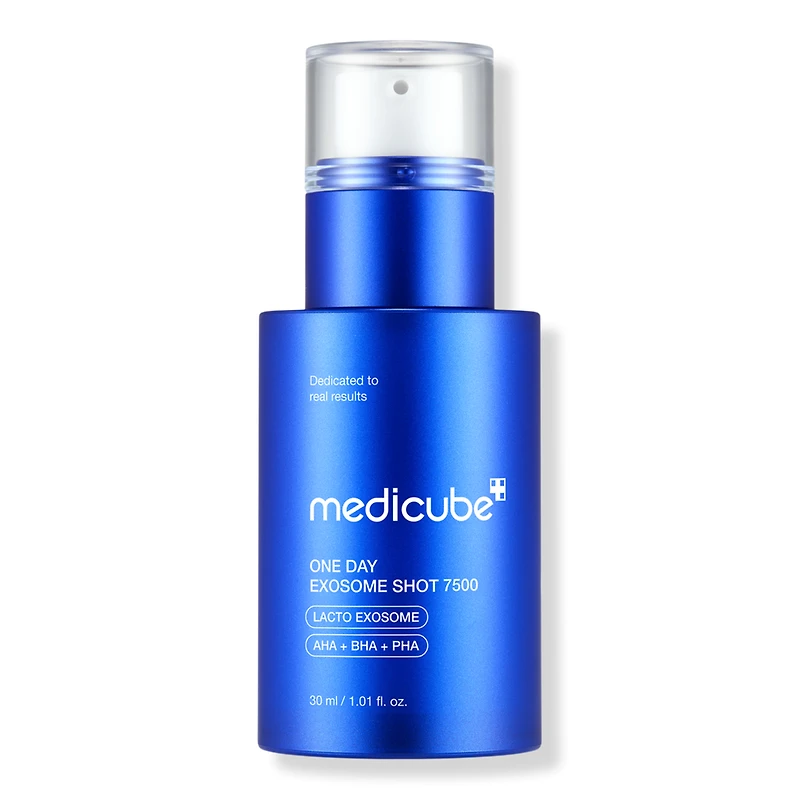 ONE DAY EXOSOME SHOT PORE SERUM 7500. Benefits: Visibly and deeply reduces pores for smoother, more refined skin. Enhances radiance while helping control excess oil. Boosts skin barrier to improve resilience and hydration. Features: High-dose 7,500 ppm exosome complex for intensive skin renewal. Dermatologist-tested and clinically proven to improve texture and pore condition. Non-sticky, fast-absorbing formula ideal for layering in any skincare routine. Key Ingredients: Exosome-coated Spicule (Hydrolyzed sponge): Taking the form of needles, spicules penetrate the skins surface like micro-needles to refine pores and improve overall skin healthdelivering deeper, more effective care than typical spicule-based products. Lacto Exosome: Medicubes patented Exosome is a powerhouse blend of peptides, amino acids, glutathione, and vitamins. It revitalizes damaged skin, boosts resilience, and targets daily skin concernspromoting natural skin health with energy and visible results. AHA + BHA + PHA: Powerhouse ingredients that aid in resurfacing textured skin, dissolving dead skin cells, and promoting skin renewal. Niacinamide: Boosts the skins barrier and delivers hydration. Panthenol: Soothes the skin and helps improve hydration levels.