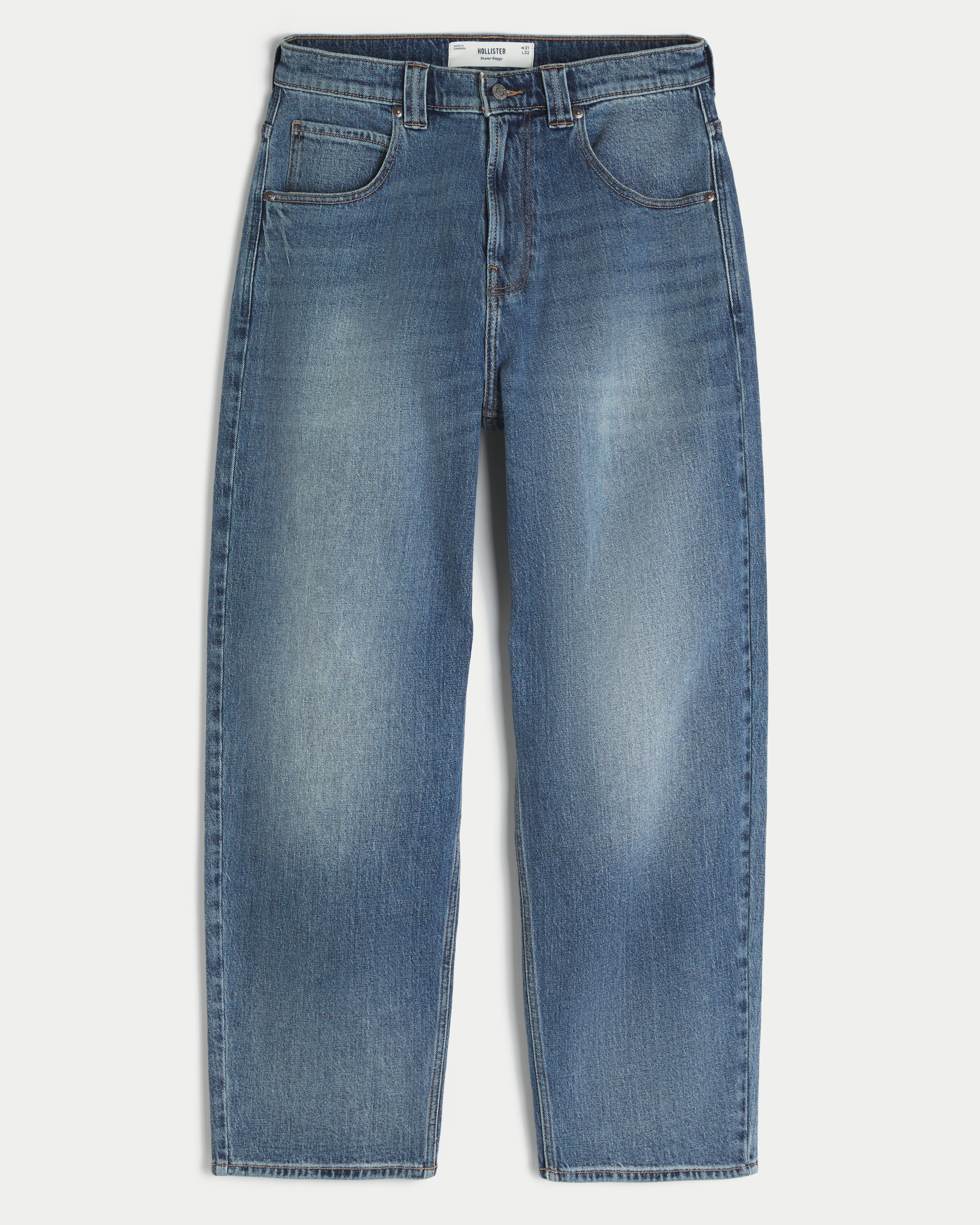 Comfortable denim skater jeans in a medium wash, designed with a baggy leg. Fading, whiskering, embroidered shark graphic at back pocket. Imported.