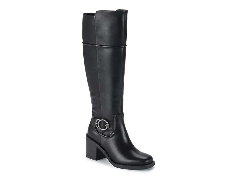 The Baretraps Melody boot will keep you looking in prime style. Whether it's the crafty horizontal and vertical stitches, edgy square toe, or the charismatic ankle buckle, the tall boot can never become any less admirable. Its stitches are from threads made from 100% recycled materials to promote sustainable wear.