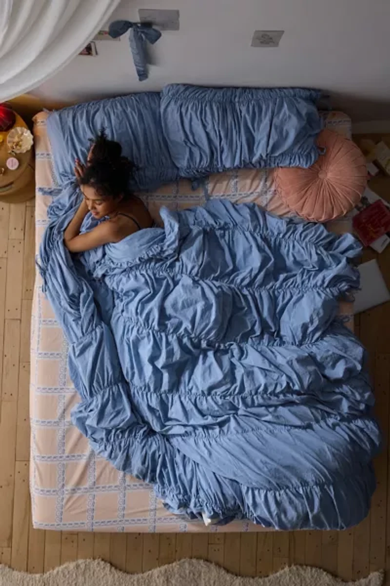 Bring textural appeal to your bed with this ruched duvet cover in our signature core cotton fabrication. This lightweight, gauzy cotton duvet cover features cinched detailing allover the top panel with a solid panel at the reverse. Pair it with our Melody Cinched Core Sham Set for a coordinated ruched bedding set. Available exclusively at Urban Outfitters.