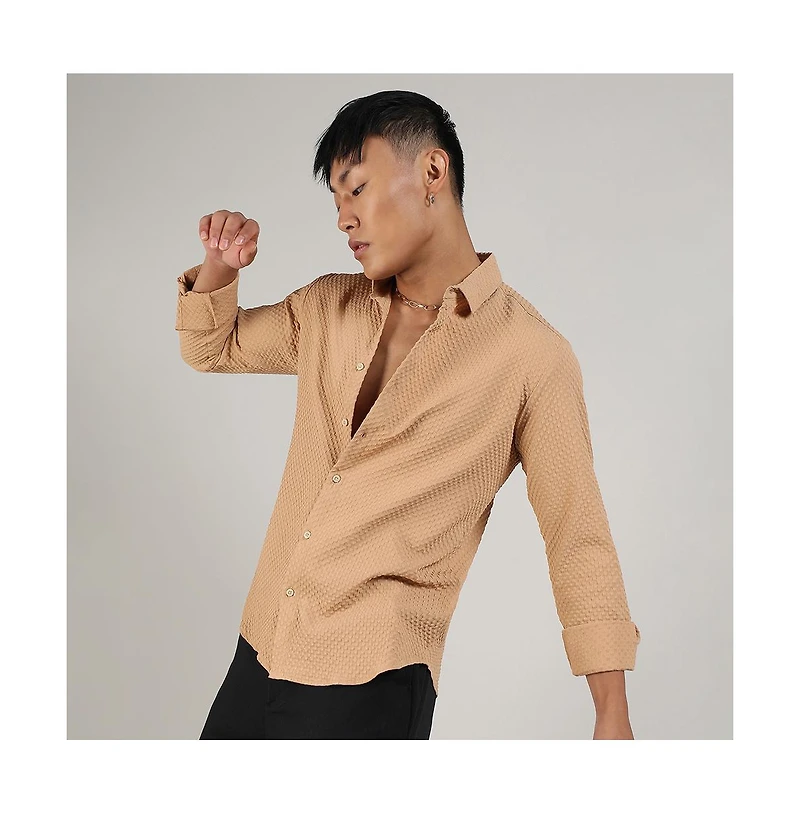 Men's Beige Textured Micro Buffalo Check ShirtMen's Beige Textured Micro Buffalo Check Shirt