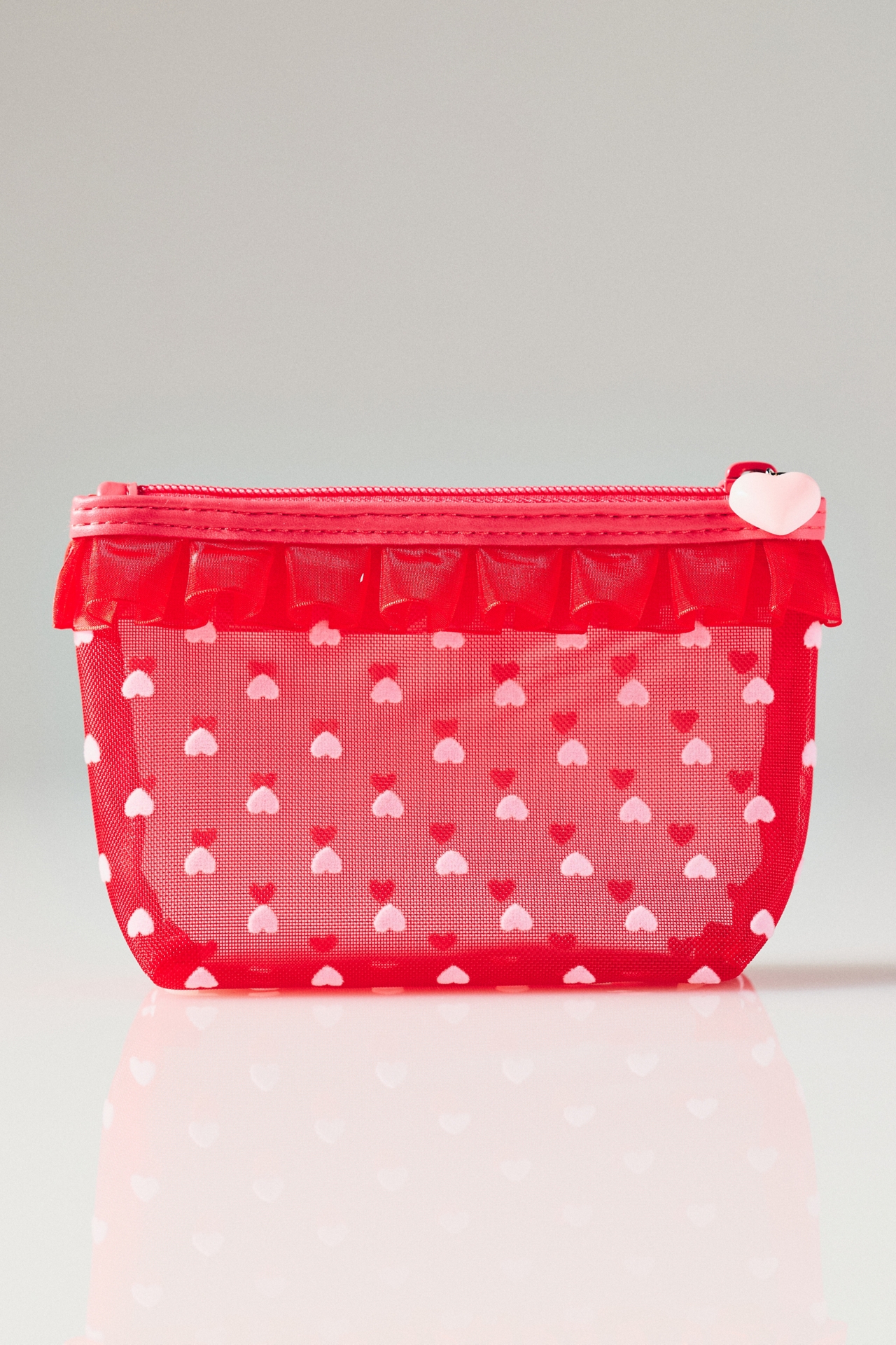 A lovable mesh pouch dotted with tiny hearts and finished with a sweet ruffle.