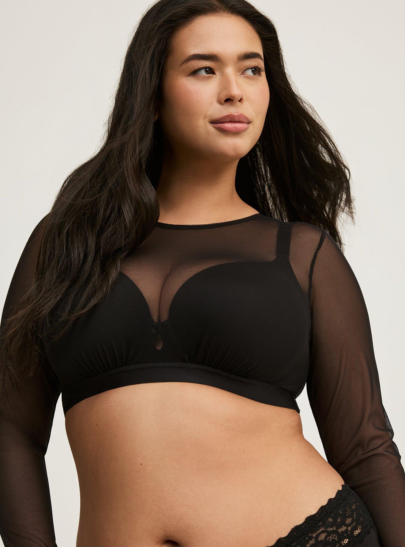 FIT Model is wearing size 1 with Torrid Strapless Bra. MATERIALS + CARE Nylon/spandex blend. Wash cold; dry flat Imported plus size bra DETAILS Crew neck Long sleeves Sheer (bra sold separately) WHY WE LOVE IT This alluring see-through crop top is great for layering under-it-all. Pair with your favorite Torrid Bra for optimal support.