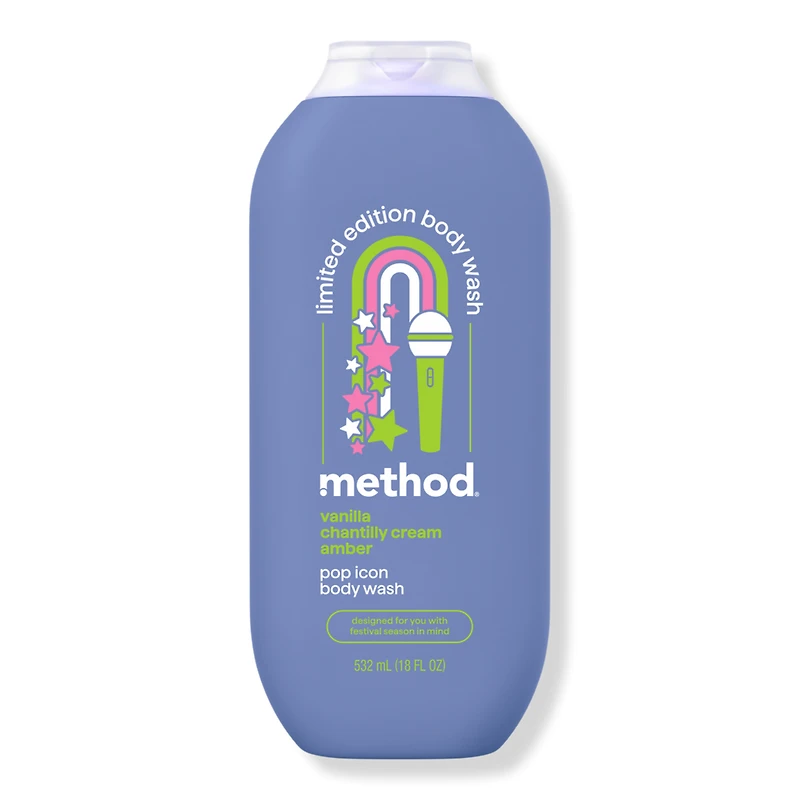 FESTIVAL FEEL BODY WASH POP ICON. Benefits: Leaves skin feeling soft, fresh, and smelling delightful.. Method Pop Icon Limited Edition Body Wash is made without parabens or phthalates.. Smells like a sweet pop of vanilla, chantilly cream, and amber.. Key Ingredients: Lauryl lactate softens skin. Methyl glucose caprate/caprylate/oleate is an emollient ester which helps soften and condition skin. Polyglyceryl-3 laurate provides moisturization. Formulated Without: Made without parabens or phthalates..
