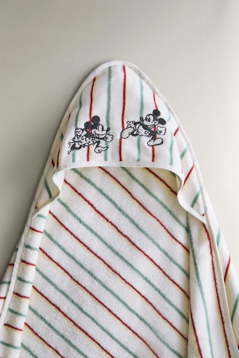 Hooded bath towel made of velour cotton, with a striped design and embroidered with Mickey & Minnie ©Disney characters.